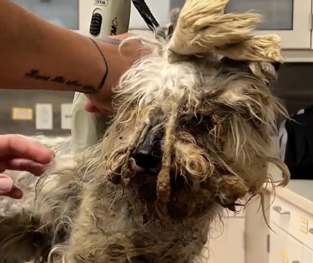 The groomer approached carefully, knowing this would be a challenge. Slowly and patiently, she trimmed, brushed, and detangled, working through the knots with gentle precision.